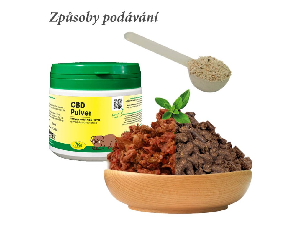 Sypký, jemně mletý doplněk výživy CBD prášek vmícháme psovi do krmiva. Ve většině případů je dobře přijímán, pokud máme doma odmítavého jedince můžeme doplněk vmíchat do mletého masa - syrového nebo mírně povařeného (lépe voní).
