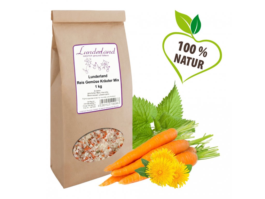 Předvařená, loupaná rýže / Karotka / Kopřiva / Pampeliška – obsah zeleniny je min. 20 %.